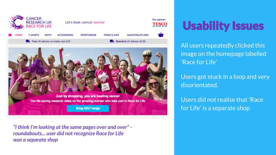 The website page mislead users into thinking it was the 'Race for Life' shop. CRUK had not one, but multiple online retail channels. The labels, categories and website structure of multiple 'home pages' hugely confused and frustrated users.