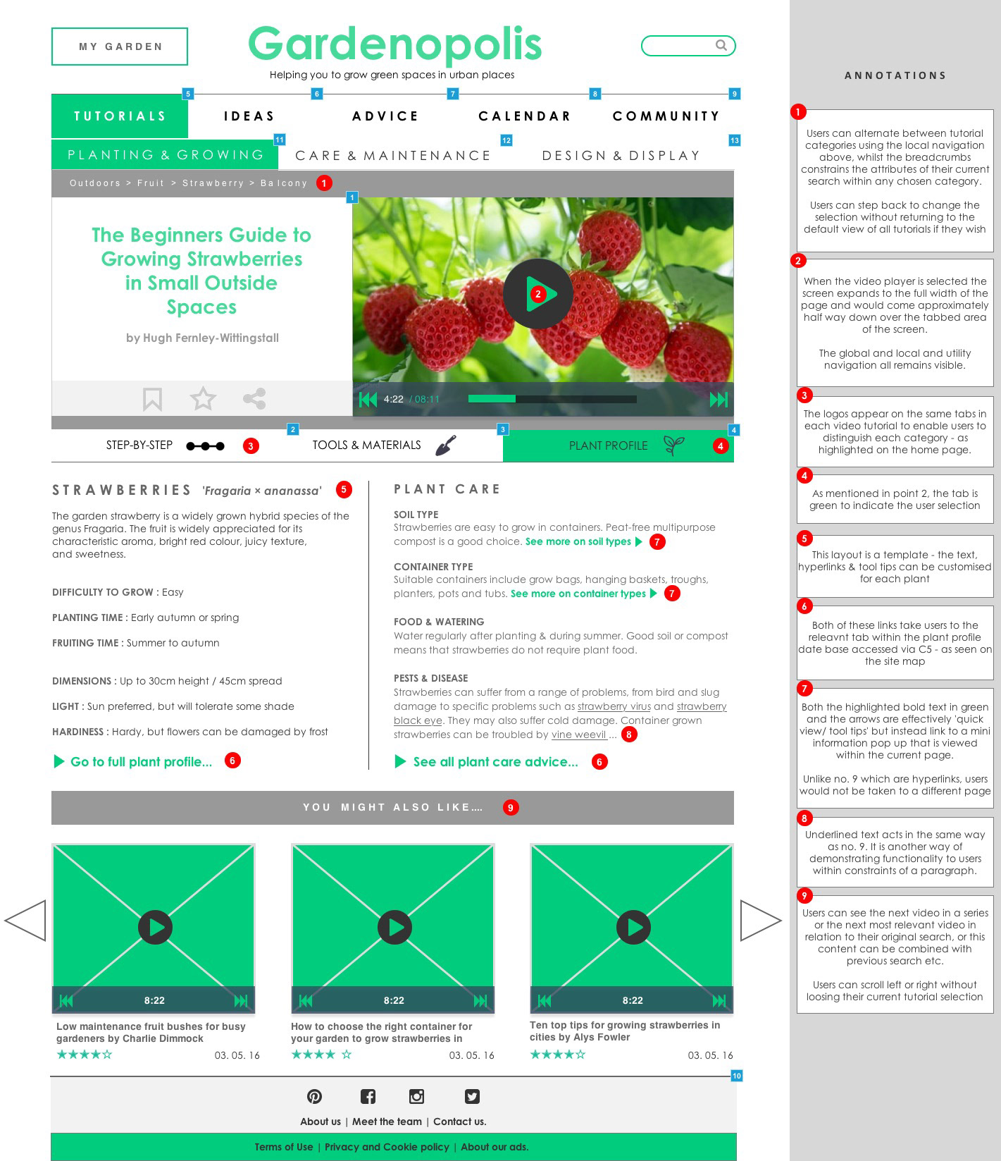 The main challenge has been to organise a set of online video tutorials, each accompanied by a step by step guide, shopping list, and importantly plant care and information, that can be searched according to a wide variety of user needs that vary according to skill, experience, type of garden or space available, budget and seasonality.