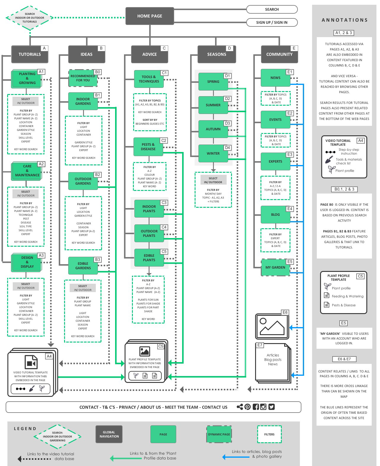 Dan Brown argues that, “Sitemaps are content! [...] linking is what gives content structure beyond itself”(2011, p.96).The sitemap underscores this point as it was designed to enable users to search and discover three main types of content, video tutorials, plant profiles & articles, the linking of which is as much a feature as the filtering of it is.